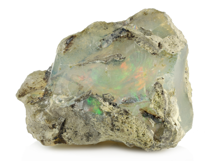 Opals form as colorless, white, yellow, red, orange, green, brown, black or blue, and may be transparent, translucent or opaque. They have a brittle tenacity and are usually cut en cabochon to show their full play of color. Solid Opal refers to stones consisting wholly of Precious Opal, while thin, but beautiful layers are sometimes made into doublets (with a supportive backing), or triplets (having a backing and a crystal dome over the top for protection).